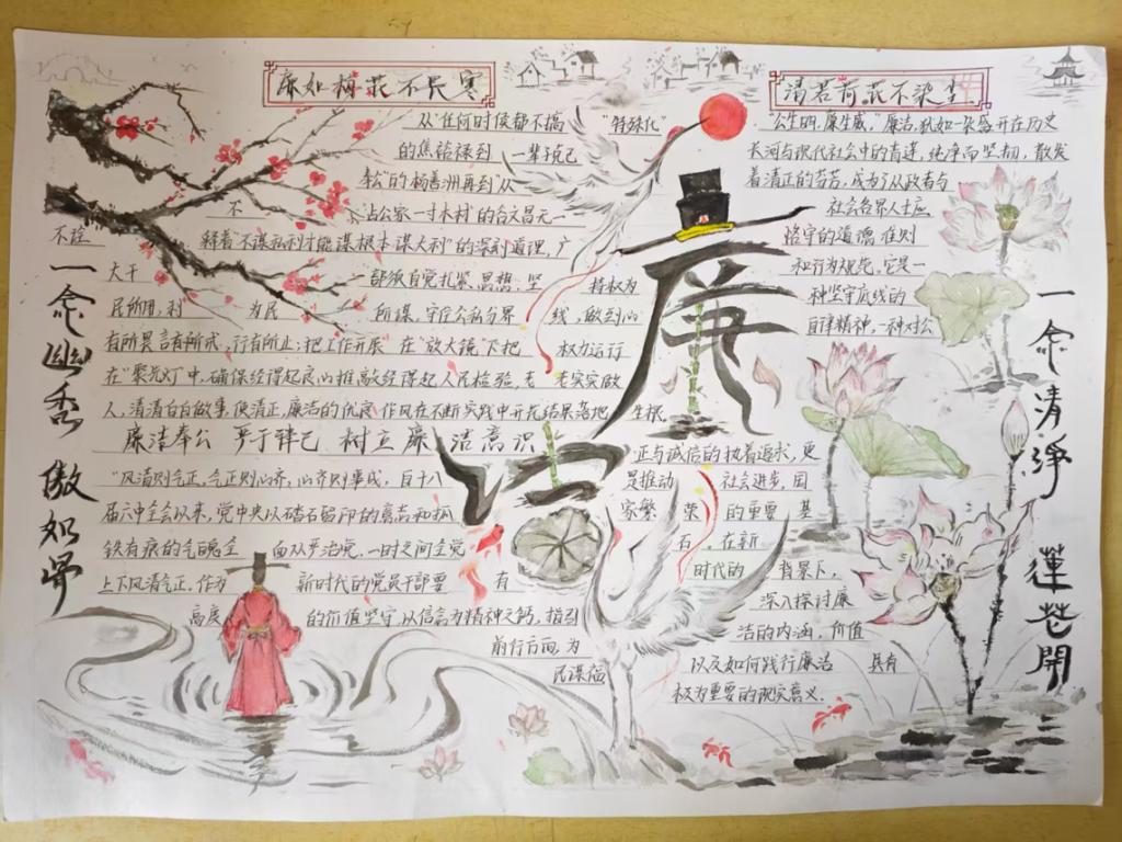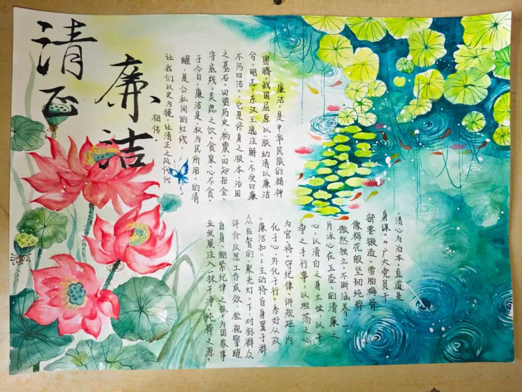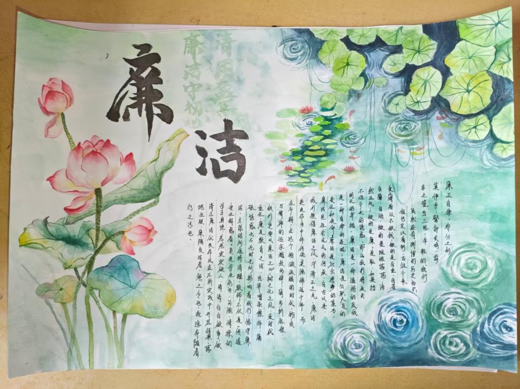 获奖作品不仅是学子创意的结晶,更是廉洁理念的生动传递。如今,一幅幅主题鲜明的手抄报已在主教楼一楼前展出,有的绘莲花寄寓高洁品格,有的书“清廉”诠释初心,每一幅都成为传递清风正气的鲜活载体,让廉洁精神在校园的驻足观赏间持续传递、深深扎根。
