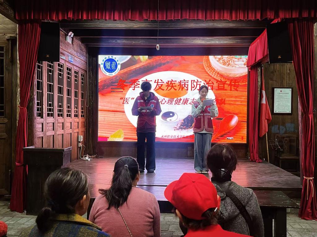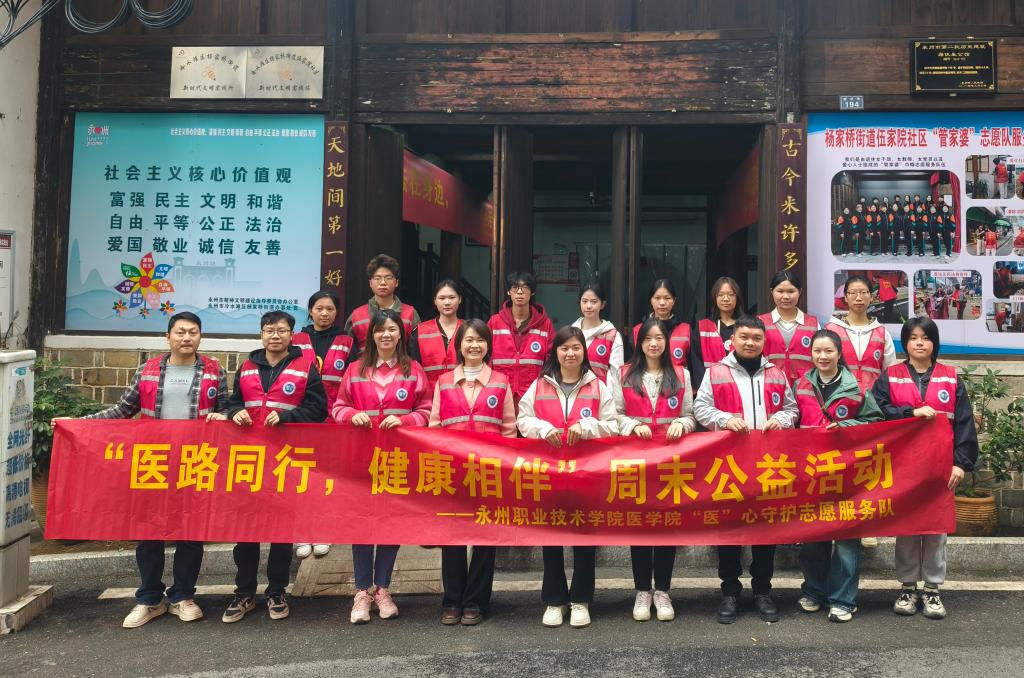 11月9日上午,永州职业技术学院医学院“医”心守护志愿服务队一行前往冷水滩区伍家院社区,成功开展“医路同行,健康相伴”周末公益志愿服务活动。服务队精心组织医学专业师生走进社区,聚焦老年人冬季健康核心需求,系统普及冬病预防知识、规范日常用药方法、疏导冬季情绪困扰,切实提升老年人冬季生活质量与健康保障水平,为社区文化生活注入暖心活力。