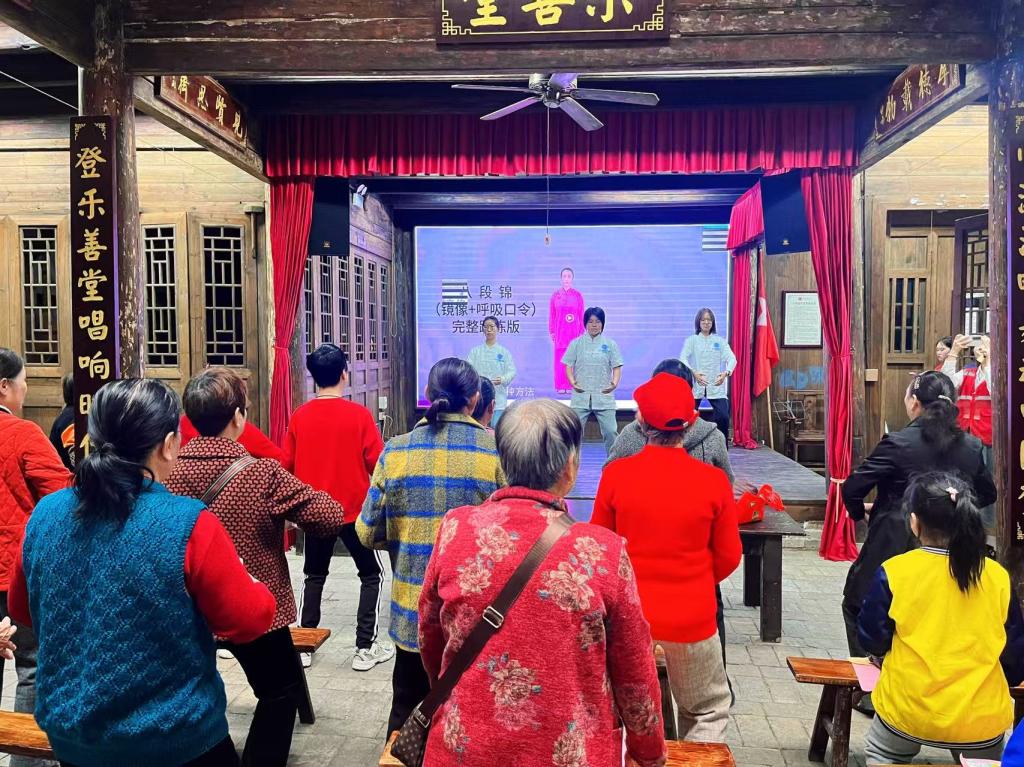 活动现场暖意融融,志愿者们以通俗生动的健康宣讲拉开序幕。针对冬季老年人高发的感冒、支气管炎、高血压、关节炎等疾病,志愿者们结合时令特点,用“家常话”详解病因机理、典型症状及核心预防要点。宣讲环节格外注重实用性,志愿者们不仅细致分享了颈肩腰腹分层保暖、温补食材搭配等适配老年人的养生技巧,更亲身示范、逐动作指导老人们学习八段锦,充分调动大家的参与热情;同步开展的呼吸操教学,针对性强化呼吸道防护,为抵御冬季呼吸道疾病筑牢屏障。