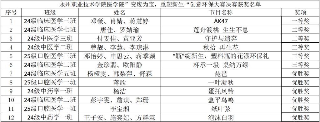 12月16日晚,永州职业技术学院医学院“变废为宝,重塑新生”创意环保大赛决赛在多媒体阶梯教室二顺利举办!为传递绿色环保理念、倡导循环发展风尚,普及可持续发展知识,一场创意与环保碰撞的赛事就此拉开帷幕。20支队伍经初赛线上投票激烈角逐后脱颖而出,携创意佳作同台竞技,以奇思妙想让废旧物品焕发新生,为师生呈现了一场融合环保价值与创意巧思的视觉盛宴。