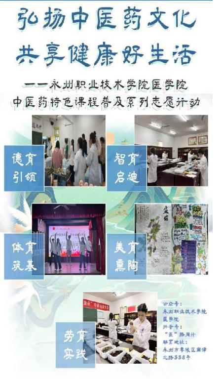 近日,以“弘扬中医药文化,共享健康好生活”为主题的中医药特色课程普及行动,在永州市社会科学普及主题活动周正式开展。本次活动配合职业教育活动周同步进行,响应了2025年活动周“一技在手,一生无忧”主题,展现了职业教育服务国家战略需求、服务区域经济社会发展和服务人的全面发展。