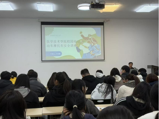 为深入贯彻落实交通安全教育要求,切实筑牢师生安全防线,提升全员交通安全意识与自我防护能力,经过精心组织,2025年11月17日,医学技术学院党支部尹其磷书记、学校后保处朱忠明科长在医学技术学院第八阶梯教室开展交通安全专题讲座。学院全体进行车辆登记的学生到场参会,认真聆听学习,现场秩序井然、氛围浓厚。