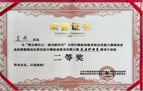 经过两天紧张激烈的角逐,吴燕老师凭借扎实的理论知识、精湛的操作技能,在全省11所高职院校中脱颖而出,以理论+操作综合全省第二名的成绩荣获养老护理员赛项二等奖,永州职业技术学院荣获优秀组织奖!