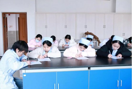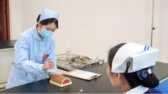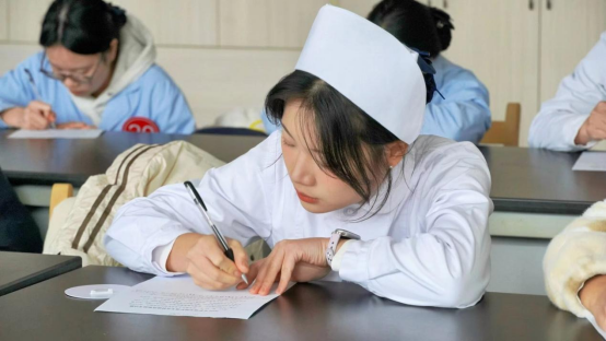 考核现场,氛围严肃而紧张。学生们首先要完成理论考试现场答题,随后按照抽签确定的顺序,有条不紊地进入实操考核环节。她们身着整齐的护士服,佩戴胸牌,以饱满的精神状态投入其中。