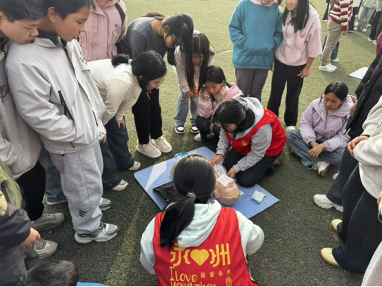党员带头作示范,让实操技能落地生根。理论讲解结束后,活动转场至操场实操区,这里成为党员志愿服务队践行“我为群众办实事”的生动课堂。党支部成员与护理专业志愿者组成指导小组,实行“一对一”教学模式,手把手带领同学们模拟完整急救流程。从“评估环境安全、大声呼救并拨打120”的前置步骤,到胸外按压与人工呼吸的规范配合,再到AED(自动体外除颤器)的电极片粘贴、开机操作等关键环节,党员教师和志愿者们俯身校正手势、精准指导力度,用耐心与细心帮助同学们突破“不敢做、不会做”的心理障碍。低年级学生被热烈的学习氛围吸引,纷纷围拢参与模拟训练,在志愿者的搀扶下,用稚嫩的小手练习按压动作,让急救技能的传承充满温度与希望。