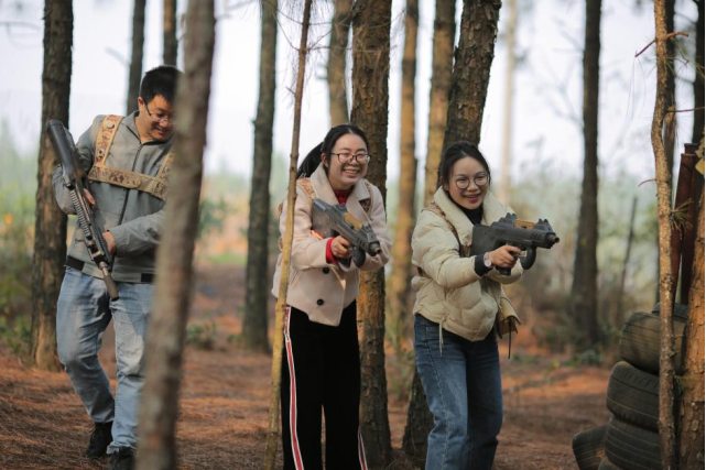 “立正,向右看齐”,随着军训教官的一声号令,人才们迅速排队集结,学校党委委员、组织人事部部长熊礼杭作活动动员讲话,他勉励大家:“全面发展,提升自己,兴永爱永、兴校爱校,做理想信念的捍卫者,做新时代的奋斗者,为学校和永州的发展添砖加瓦”。随后,在教官的指导下,人才们“手提冲锋枪,肩扛弹甲包”,分成4组分别开展“真人CS”红蓝对抗,冲锋、切割、包围.......既考验大家的勇气和谋略,也考验大家的体力和耐力。尽管在奔跑中满头大汗,气喘吁吁,但是大家不怕苦,不怕累,充分发挥自身团队协作能力和聪明才智,收获了真实战场环境下才能激发出来的勇气、信念、谋略、战友情。接着,“破冰行动”、打靶射击、同心击球等竞技活动纷纷上演,深化了队员之间相互帮助相互配合的团队意识。