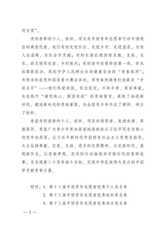 本次评选活动授予了258名个人第十三届“中国青年志愿者优秀个人奖”,100个 “中国青年志愿者优秀组织奖”,100个 “中国青年志愿者优秀项目奖”。受到表彰的个人、组织、项目是中国青年志愿者行动中涌现出的典型代表。他们用实践兑现了热爱祖国、信念坚定,不辞辛劳、真诚奉献、矢志践行“请党放心、强国有我”的青春誓言,展现了奋进新时代、建功新时代的青春豪情,为全国青少年作出了榜样,树立了标杆。