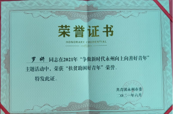 围绕庆祝中国共产党成立100周年主题,广泛挖掘我市各领域、各行业青年典型,深入推进青少年社会主义核心价值观建设,今年5月团市委组织开展了2021年“争做新时代永州向上向善好青年”主题评选活动。校团委推报的医学技术学院2019级眼视光班罗妍同学荣获“扶贫助困好青年”荣誉。