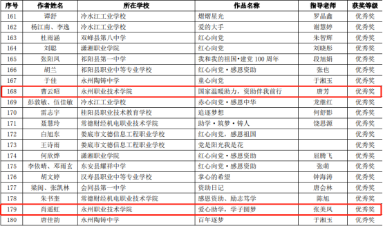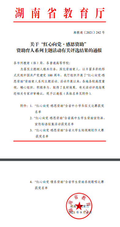 本次大赛由湖南省教育厅主办,旨在以丰富多彩的形式庆祝中国共产党成立100周年。本次活动加强了学生的思想道德教育,增强了爱党爱国热情,使同学们更加懂得感恩、成长、成才、责任和奉献的意义。此次我校能够在全省众多学校中获得多个奖项,充分展现了我校资助育人教育的显著成果。
