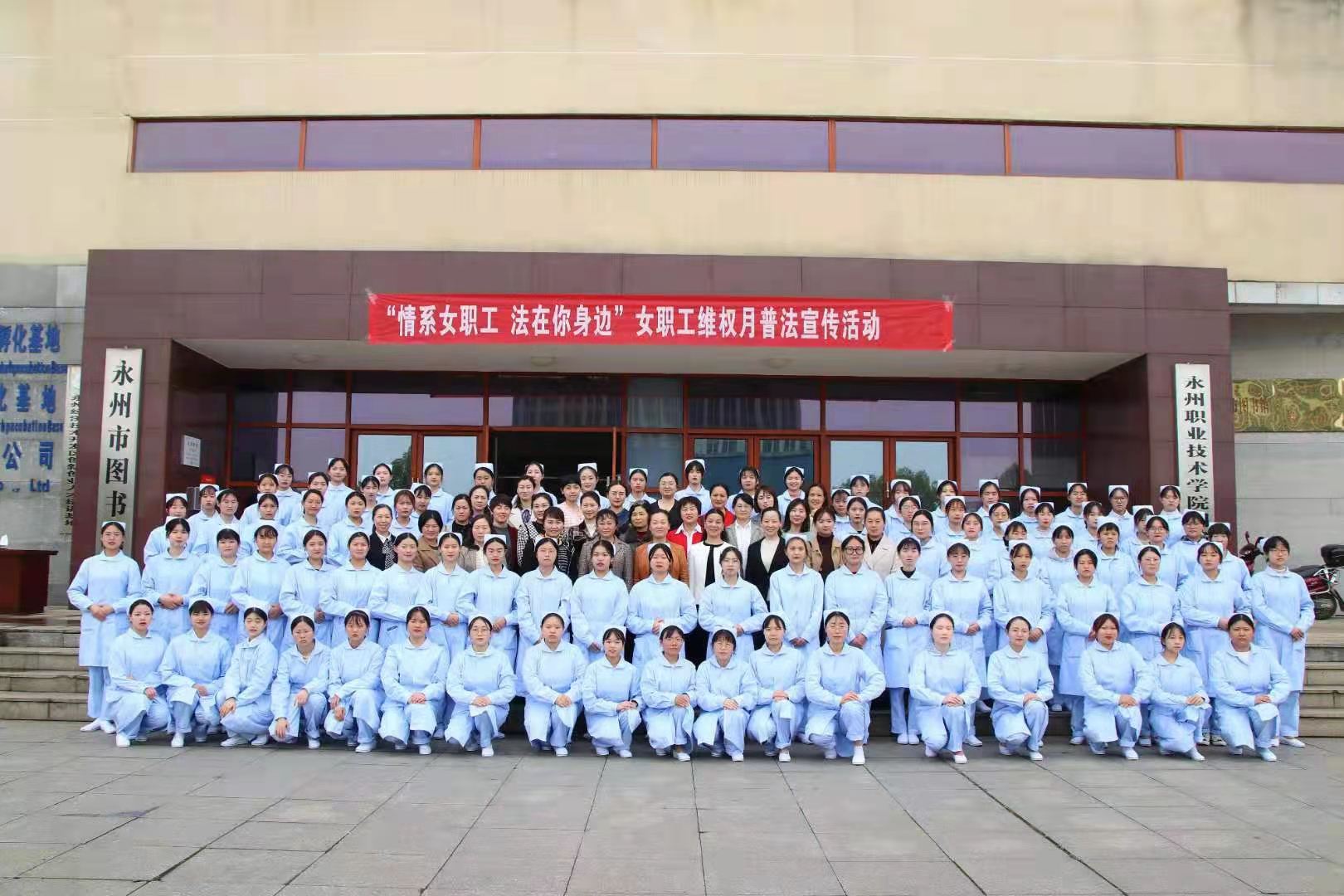 为进一步维护女职工合法权益和特殊利益,普及相关法律知识,3月26日,永州职院工会、女职委、妇委会与永州市总工会在永州职院图书馆广场联合举办女职工维权普法活动。在活动现场,发放了《女职工劳动保护特别规定》、《妇女权益保障法》、《反家庭暴力法》等法律法规权威解读宣传单近千册,答疑解惑有关法律法规知识,较好的普及了相关法律知识,宣传弘扬了法治精神。