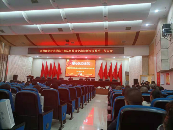 3月11日上午,永州职业技术学院召开干部队伍作风突出问题专项整治工作会议,动员全校党员干部进一步统一思想,提高认识,坚决狠刹“四风”,严防反弹回潮,确保专项整治工作取得实效。会议由校党委书记黄小明主持,在家的校领导、全校副科及以上干部参加会议。