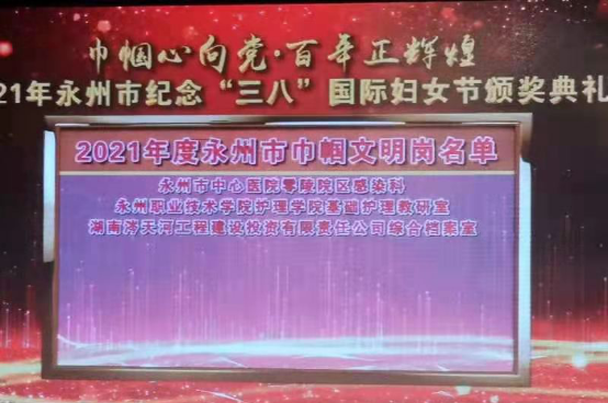 3月7日,从永州市妇联举办的2021年永州市纪念“三八”国际妇女节电视颁奖典礼上传来喜讯,我校护理学院基础护理教研室在2021年度全市城乡妇女岗位建功创建活动中,由于成绩突出,被永州市妇联授予2021年度“永州市巾帼文明岗”荣誉称号。