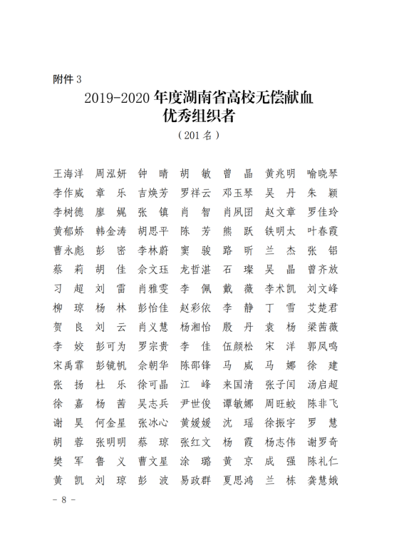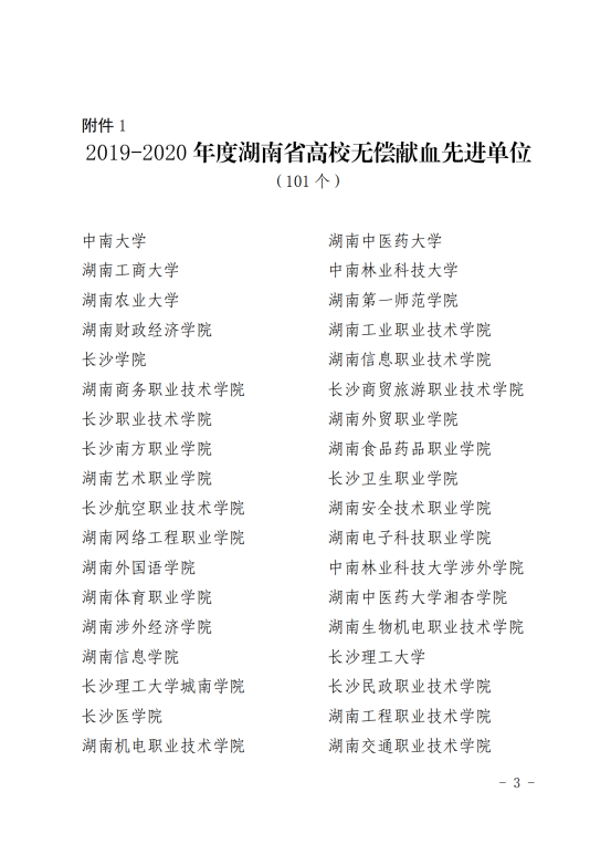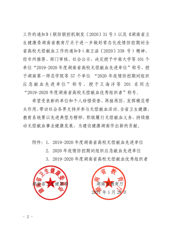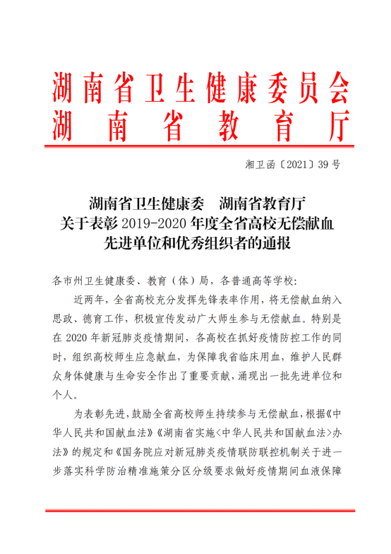 近日,湖南省卫生健康委员会、湖南省教育厅联合下发了《关于表彰2019-2020年度全省高校无偿献血先进单位和优秀组织者的通报》,对我省在无偿献血方面作出重要贡献的单位和个人进行表彰。