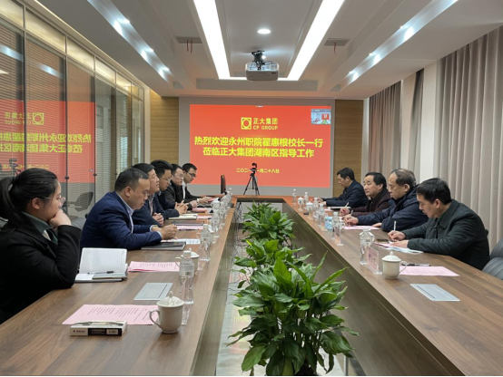 为了全面推进现代学徒制,应正大集团湖南区资深总裁李建平邀请,1月28日,学校党委副书记、校长翟惠根教授,党委委员、副校长韩立路教授,农学院院长于桂阳教授、专业教师高仙、刘成等一行5人,专程赴正大集团湖南区长沙总部,共同商议全面推进现代学徒制有关事宜,并线上看望了永州职院就职正大优秀毕业生和顶岗实习学生。正大集团湖南区养殖事业总裁赵会锋,湖南区饲料事业资深副总裁刘义,湖南区人力总监周伟光等出席了会议。