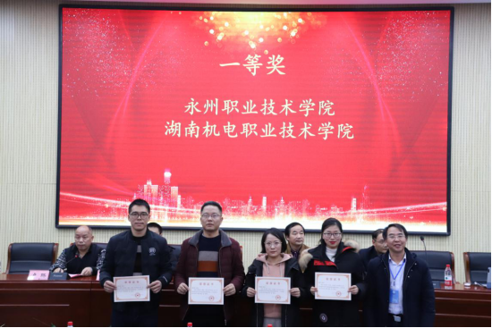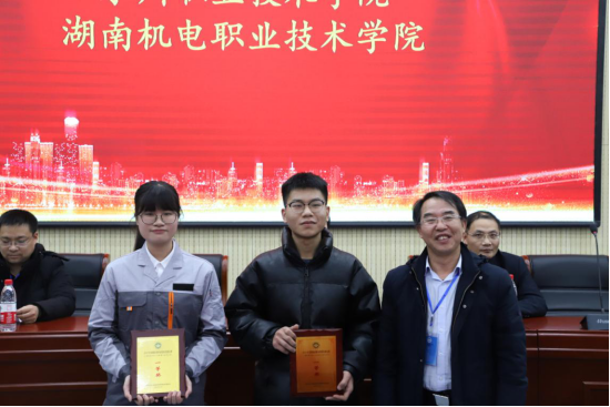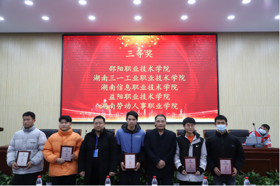 会议现场,与会领导和专家为获奖代表队颁发奖牌和获奖证书。我校学生李雨、覃炜荧、廖铭,湖南机电职业技术学院阳亮、陈君保、柏承标获得“工业机器人技术应用 ”赛项一等奖。