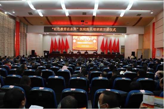 为贯彻落实习近平总书记考察湖南重要讲话精神和深入开展“红色教育在永州”学习活动,推进红色教育“进医院”,12月4日上午,“红色教育在永州”第一期医院院长培训班在永州职业技术学院举行了开班仪式。永州职业技术学院党委书记黄小明,市卫健委党组成员、副主任刘建雄,永州职业技术学院党委委员、副校长窦铁生出席,市卫健委、市委卫健工委党校、市卫健系统干部教育培训基地、永州职业技术学院相关工作人员以及来自全市300余名医院院长参加。仪式由永州职业技术学院党委委员、组织人事部长熊礼杭主持。