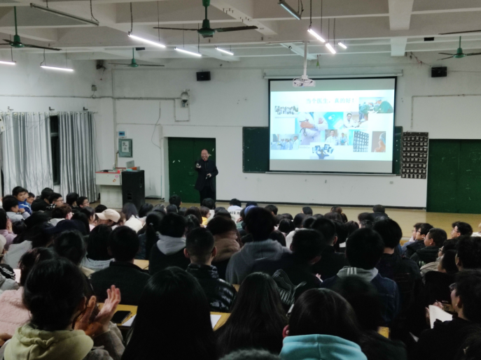 刘庆国教授从当个好医生的目标、标准、做法、所需能力四个方面,采用理论讲解、举例说明、能力测试和现场问答的方式,与同学们探讨了如何当一名好医生。刘教授的讲述细致生动,赢得了现场的阵阵掌声,现场气氛热烈。提问环节时,同学们争先恐后提问发言。刘教授通过锡酒壶中毒的病例,展示如侦探破案似的诊断手法,激发同学们的学习热情;通过讲述优秀校友湘雅医院张湘生教授当年在双牌基层从医救治病人的感人事迹和成长历程,帮助同学们树立信心和理想!