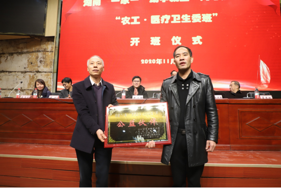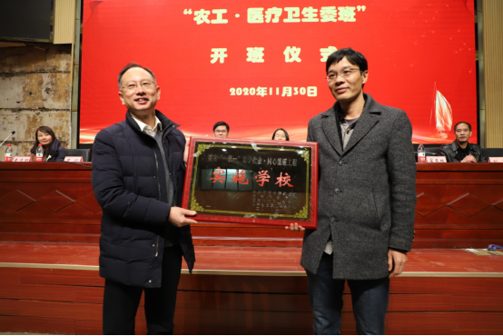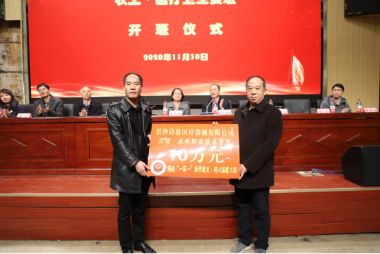 仪式上农工党湖南省委会授予永州职业技术学院“湖南‘一家一’助学就业·同心温暖工程项目实施学校”和“农工·医疗卫生委班”牌匾,授予长沙诗恩医疗器械有限公司“湖南‘一家一’助学就业·同心温暖工程公益伙伴”牌匾。