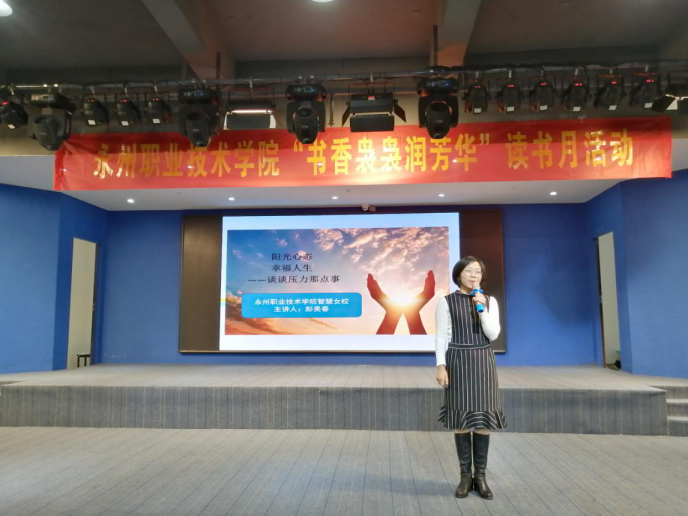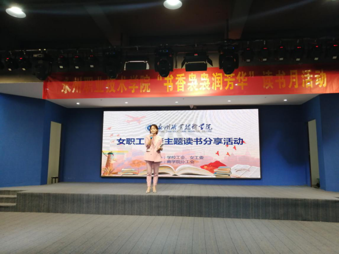 为贯彻落实全国总工会关于加强职工思想政治工作、深化职工主题阅读活动精神和职工家庭家风家教建设的精神,根据省总工会《关于开展“湘悦读·工力量”2020年全省职工主题阅读的通知》、“阅读城市·书香永州”全民阅读活动和我市创建国家公共文化服务体系示范区相关要求,提高教职工思想政治素养,打造学习型教师群体,建造“书香校园”,9月24日下午,永州职业技术学院工会、女工委主办,商学院分工会承办的“潇湘悦读·工人力量”2020年学校女职工主题阅读活动在校图书馆五楼举行,校工会主席李晶,校党委委员、宣传统战部部长裴有为,原副校级干部刘晓兰,校工会副主席、女工委主任程丽华出席活动。