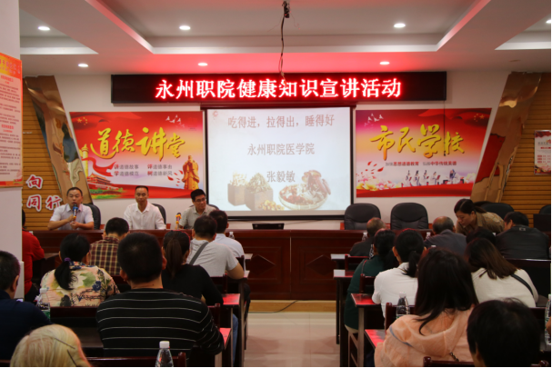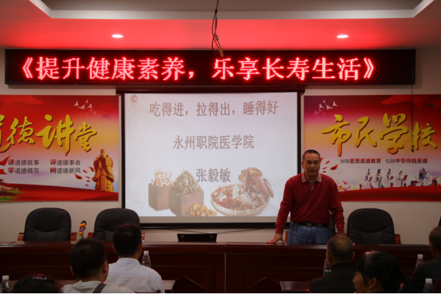 在柳子街社区开展的活动以《提升健康素养,乐享长寿生活》为主题,由永州职院医学院张毅敏老师通过讲座的形式宣讲老年人如何吃、怎么排、怎样睡等养生保健知识,增强社区老年人健康意识,提高老年人健康水平。