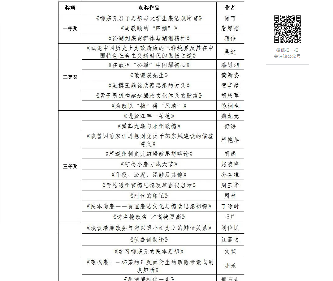 为弘扬永州“道德之乡”、“廉洁之源”的清廉文化思想,以中华优秀传统文化的“政德”思想推进全市的廉政区县建设,加强新时代廉政文化的普及和推广,永州市纪委监委和市文联特举办本次面向全国的征文活动。本次活动历时三个月,要求以小切口呈现大主题、以小视角反映大变化、以小事例承载大内涵,将廉政文化融入文学创作中,呈现文学性、思想性、趣味性于一体的作品形式,要求严、面向广、规格高是本次征文的特点。在全市各级纪委监委和文化管理部门的积极宣传和深入推广下,共收到全国各地文学爱好者投稿233篇,其中不乏知名度很高的永州地方文化研究的资深学者、著名媒体工作者、高校的文化研究专家和社会知名作家。在湖南作协专家评委组的认真、公正、精心、严格鉴评下,共在全国来稿中评选出一等奖3名、二等奖6名、三等奖10名,优秀奖20名,我院赵凌峰老师撰写的《守得小廉方成大节》获得三等奖。该文在《潇湘》杂志上全文刊发,并入选《“濂溪杯”优秀传统文化与古代政德典范征文作品集》