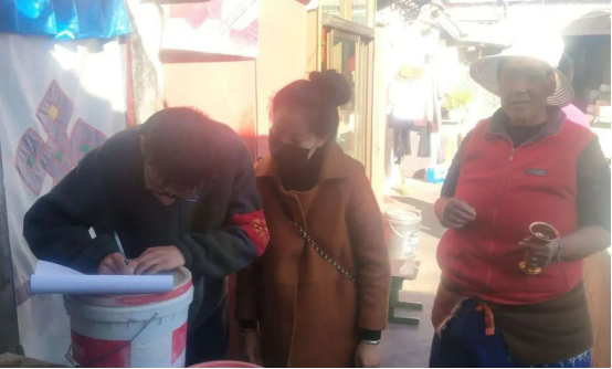 农学院2019级三年制牧医1班学生旦真次旺(穿黑色衣服),在西藏拉萨市城关区东孜苏三巷参对外来人员进行排查登记