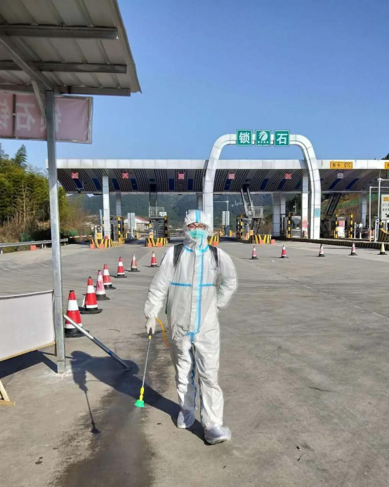 医学院2018级临床2班学生赵杰之在双峰县锁石收费站,为来往人员和车辆进行喷洒消毒
