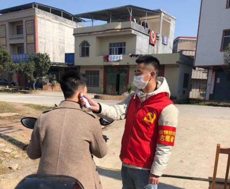 谢力剑,医学院2018级药学2班,1月27日开始,参加中共湖南省永州市宁远县保安镇鲤塘村村委会支部开展的疫情防控志愿活动,积极参与新型肺炎体温检测和执勤(24小时轮班),在本镇村口为进出的群众提供体温测量和登记服务。