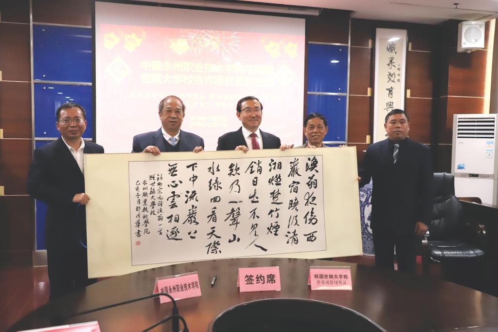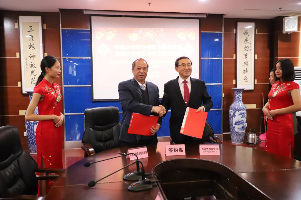 接着,双方就学生学历提升、互访交换、师资培训、合作办学等方面进行了深入交流探讨。最后,翟惠根校长与李昇勋总长分别代表两校签署了校际合作项目框架协议书并合影留念。