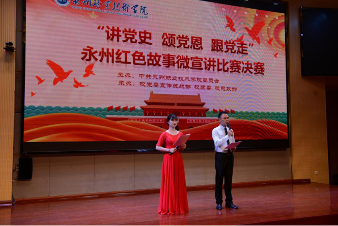 参加本次决赛的队伍由学校各党支部选送,分为教师组和学生组,通过预赛教师组和学生组分别选出10支队伍参赛。“嘉兴南湖上一支画舫里十几个年轻人正在轻声诵读《共产党宣言》......”决赛在商学院党支部李小康、张玉洁老师的情景微宣讲《弘扬红船精神不忘初心使命》中拉开帷幕,随后,各参赛队伍深情并茂地讲述了“黄埔三杰”之首蒋先云,党的建党先驱、理论巨匠李达,断肠明志陈树湘,《松树的品格》陶铸,女共产党员柏忍、铮铮铁骨何宝珍,革命烈士郑作民,一心为民江华,毛泽东友人乐天宇等永州先辈的英雄事迹。一个个红色故事吸引了台下在场师生专注的目光,将师生仿佛带到了那段可歌可泣的峥嵘岁月,会场不时爆发出雷鸣般地掌声,部分师生在听宣讲时感动得热泪盈眶。20个微宣讲为在场的师生们呈上了一场丰盛的“精神盛宴”。 这既是永州职院广大师生党史学习教育成效的展示,又是推动党史学习教育创新的一道靓丽风景。