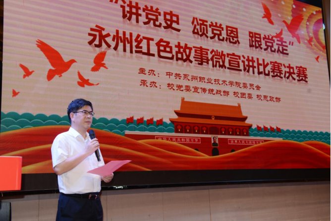 6月8日,由永州职业技术学院党委主办,校党委宣传统战部、校团委、思政部承办的“讲党史颂党恩跟党走”永州红色故事微宣讲比赛决赛在图书馆三楼报告厅隆重举行。永州职院党委书记黄小明致辞。永州市委党史学习教育巡回指导组第十二组长廖毅、副组长王金盾,校领导李国春、蒋衡湘、李晶、熊礼杭、裴有为、唐陶富、罗敏杰、刘晓兰出席。