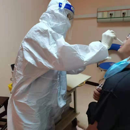 到达目的地后,同学们迅速换上了防护服进入工作状态。当天的气温高达37摄氏度,毫不透气的防护服里闷热难耐,感受到一股又一股的汗水往外冒,隔着防护服和无菌手套都能看见里面浸润的汗水。但是同学们克服一切困难坚持了下来,连续工作5个多小时,累计采集核酸样本3000余次。