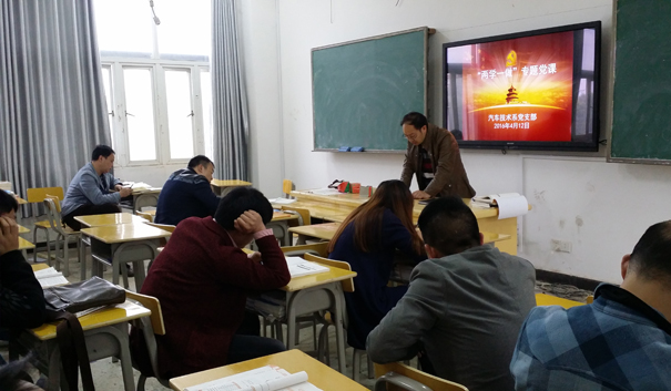 为深入贯彻落实中共中央办公厅印发的《关于在全体党员中开展“学党章党规、学系列讲话,做合格党员”学习教育方案》和我院纪委下发的《关于开展2016年反腐倡廉宣传教育月活动的通知》文件精神,进一步教育引导党员尊崇党章、遵守党规,以习近平总书记系列重要讲话精神武装头脑、指导实践、推动工作。4月12日下午,汽车技术系党支部开展了“两学一做”专题党课学习会议。会议由系党支部书记吴卫明同志主持。系部全体党员教师参加了会议。