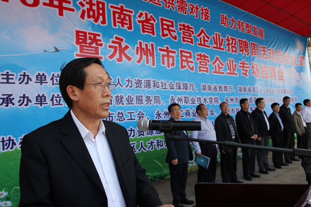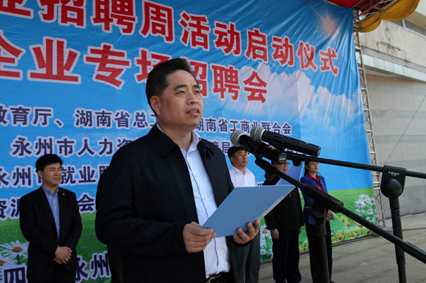 永州市委常委、常务副市长唐湘林首先代表永州市委、市政府对招聘周活动的启动表示祝贺!向亲临启动仪式的省厅领导表示衷心的感谢!向企业代表表示诚挚的问候!向踊跃应聘的毕业生表示热烈的欢迎!唐湘林副市长在讲话中详细介绍了永州市委、市政府在就业创业方面的系列优惠政策和一揽子有力举措,并着重强调就业创业服务部门要做好牵线搭桥工作,提供有效优质的帮助和服务;企业要加大宣传推介力度,以诚意和待遇吸引人才、留住人才,实现劳动者的稳定就业;广大高校毕业生及家属转变观念,抢抓机遇,珍惜机会,树立“先就业再择业”的观念,找到适合自己的岗位。