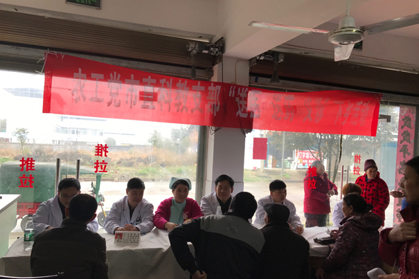 3月17日上午,农工党永州市直科教支部组织我院附属医院(永州市第一人民医院)内科、普外科、眼科、肿瘤科党员专家10余人到永州市零陵区邮亭圩中心卫生院开展送医送药义诊活动。