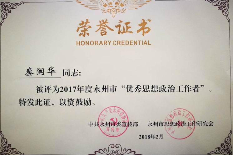 ——我院机械工程系党支部副书记秦润华获“永州市优秀思想政治工作者”殊荣