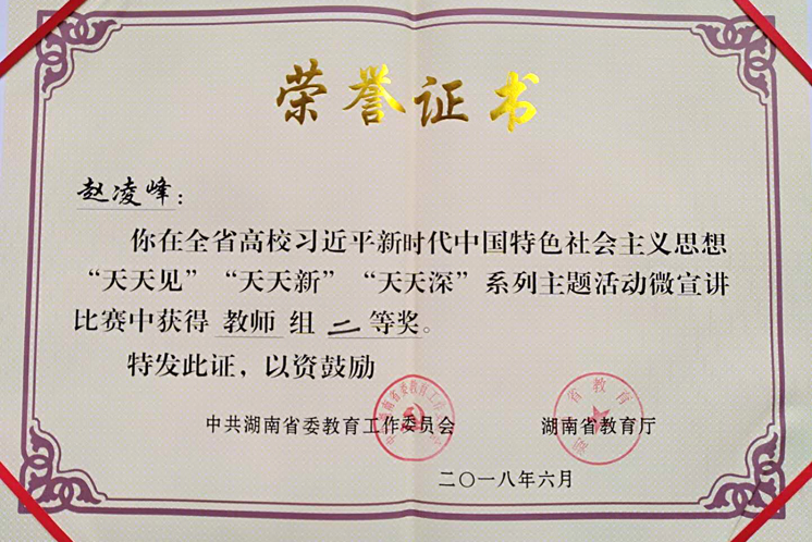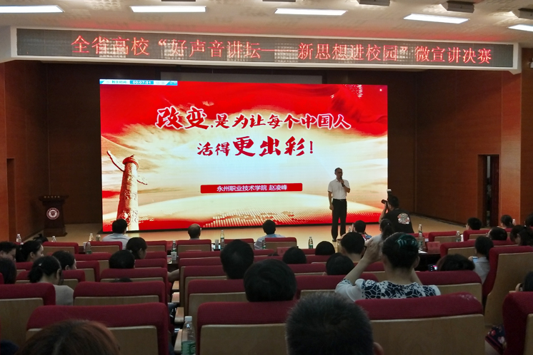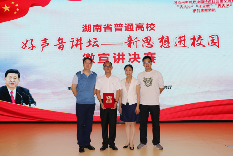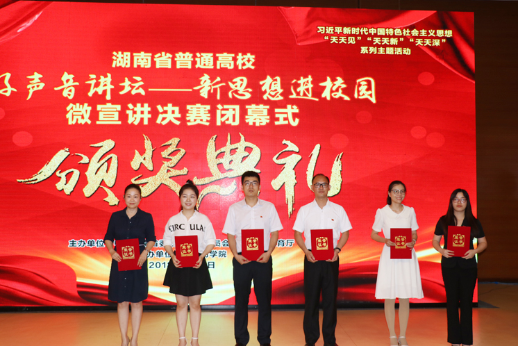 6月15日上午,由湖南省委教育工委、湖南省教育厅主办的全省高校“好声音讲坛--新思想进校园”微宣讲决赛在湖南商学院举行。我院赵凌峰老师经过院级初赛、省级复赛,最终在全省微宣讲决赛中荣获二等奖。
