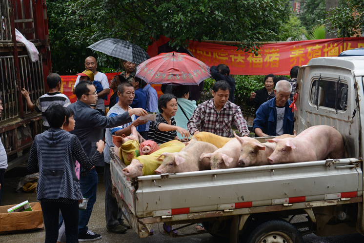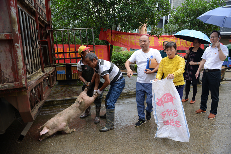 6月12日上午,细雨绵绵,小金洞村村民冒雨手拿蛇皮袋的、有提竹猪笼的、有推板车的、有开农用三轮车的,他们不约而同地汇聚“小金洞楠木王村”彩石碑中心,等待着永州职业技术学院送福猪到村。