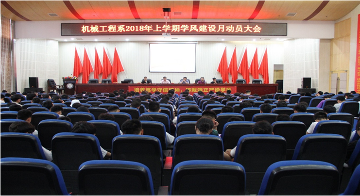 为构建优良学风建设新常态,引导学生树立良好学习风气,5月25日下午,机械工程系在办公楼二楼多媒体报告厅隆重召开了2018年上学期“学风建设月”动员大会。机械工程系院本部全体师生共同参与了此次大会。