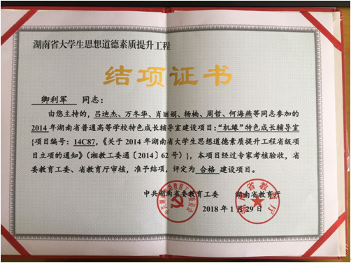 4月12日,湖南省高校大学生心理健康教育研究会第十一次年会在湖南工业大学召开,我院机械工程系“机缘”特色成长辅导室的建设通过了湖南省委教育工委、省教育厅的审核验收,被评为合格的“湖南省普通高校特色成长辅导室”。