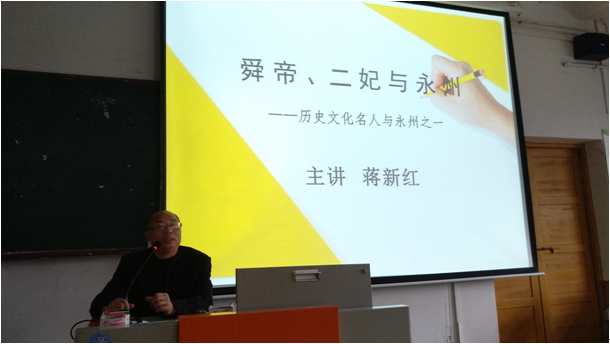 蒋新红教授以《舜帝、二妃与永州》为题目,引用丰富的史料记载和诗句,并结合他长期的研究成果,详细生动的讲述了舜帝的生平、主要功绩、轶事典故以及对永州文化的影响。整个讲座,教室座无虚席,聆听讲座的同学们热情高涨,掌声不断。