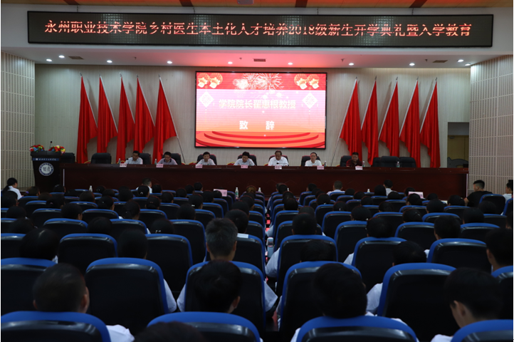 9月25日下午三点,我院2018年乡村医学班开学典礼暨入学教育在本部二楼多功能报告厅隆重举行。学院党委副书记、院长翟惠根,湖南省卫计委基层卫生处副处长龙飞、湖南省卫计委培训中心主任李世奇,永州市卫计委主任欧阳德群等领导出席了开学典礼。238名2018级乡村医学班新生及我院具体负责乡村医生本土化培训班管理和教学的相关同志参加了典礼。典礼由学院副院长韩立路主持。
