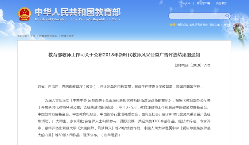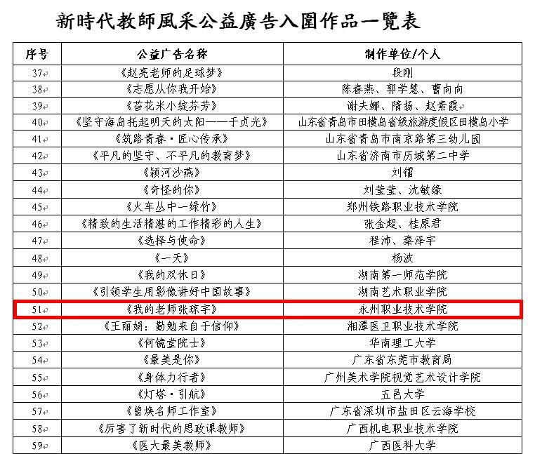 为深入贯彻落实《中共中央 国务院关于全面深化新时代教师队伍建设改革的意见》,教育部下发了《关于开展新时代教师风采公益广告征集活动的通知》。今年3-5月,教育部教师工作司联合中国教师发展基金会、中国教育发展基金会、中国教育电视台、中国视协行业电视委员会,面向全社会开展了新时代教师风采公益广告征集活动,共征集到1700余部作品。经技术筛选、专家评审,最终评选出20部优胜作品和80部入围作品。我院作为一所地方性高职院校,在没有影视类专业的情况下,能够与复旦大学、中央美术学院、四川美术学院等高校同台竞技并且荣获佳绩,实属不易。