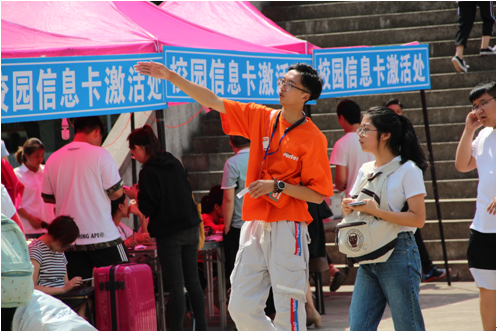 在迎新现场,各校区分组明确,各类指示牌整齐显眼,使新生与家长清晰地明确报到流程。“同学您好,请来这边。”“阿姨您请坐,请喝水。”迎新工作人员热情地接待新生,耐心地为他们办理报到手续。此外,现场不仅有志愿者们周到服务,还设置有迎新协调组,随时解决现场临时问题与及时应对任何突发情况。