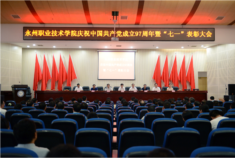 为表彰一年来在学院改革发展进程中涌现出来的先进基层党组织和优秀共产党员,向党的97周年华诞献礼,7月3日,我院在办公楼二楼多功能报告厅召开庆祝中国共产党成立97周年暨“七一”表彰大会。院领导黄小明、李国春、韩立路、窦铁生、蒋衡湘、李晶、王中军、熊礼杭、裴有为、唐陶富、罗敏杰、刘晓兰出席会议,各党(总)支部、副科级以上干部和全体党员同志参加会议。大会由党委副书记李国春主持。