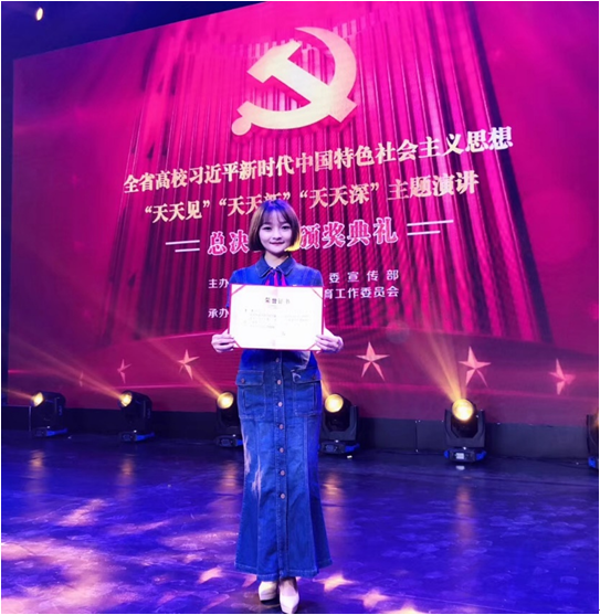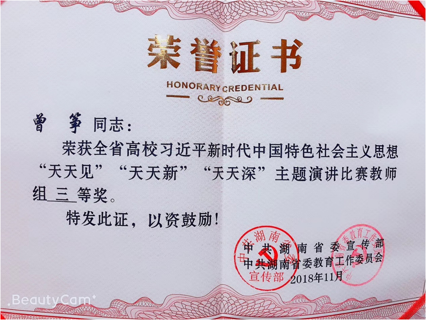 11月23日,由中共湖南省委宣传部、中共湖南省委教育工作委员会主办,湖南教育电视台承办的全省高校习近平新时代中国特色社会主义思想“天天见”“天天新”“天天深”主题演讲比赛决赛在湖南省教育电视台演播大厅隆重举行。经过激烈角逐,我院参赛选手曾筝老师以“党旗下的初心”为题的演讲荣获了教师组三等奖。