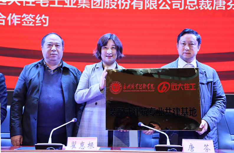 签约仪式上学院党委书记黄小明向长沙远大住宅工业集团股份有限公司总裁唐芬授予“永州职业技术学院装配式建筑人才培养基地”牌匾;唐芬代表公司向我院杨铭副院长授予“永州职业技术学院•远大住宅工业集团股份有限公司装配式建筑专业共建基地”牌匾。