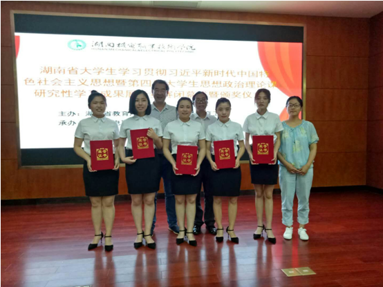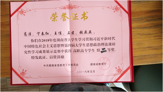 近日,从省教育厅下发的《关于公布湖南省大学生学习贯彻习近平新时代中国特色社会主义思想暨第四届大学生思想政治理论课研究性学习成果展示竞赛结果的通知》上获悉,我院宁春红、张娅娅、高洁、王佳、石君等五位同学在唐世章、李德良两位老师指导下撰写的《中华民族伟大复兴与新时代青年历史使命研究》荣获湖南省第四届大学生思想政治理论课研究性学习成果展示竞赛(高职高专组)二等奖。