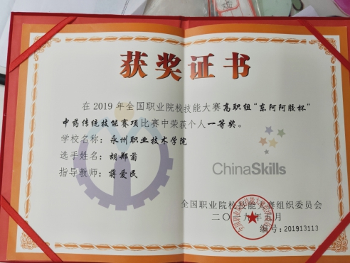 在本次竞赛中,胡郑菊同学凭借过硬的专业技能和强大的心理素质,经过两天的激烈比拼,出色完成了中药性状鉴别、中药真伪鉴别、中药调剂(含审方)、中药炮制等等相关赛项任务,展示了熟练的专业知识和专业技能,体现了良好的规范意识、职业习惯与职业素养,最终获得了一等奖的优异成绩。
