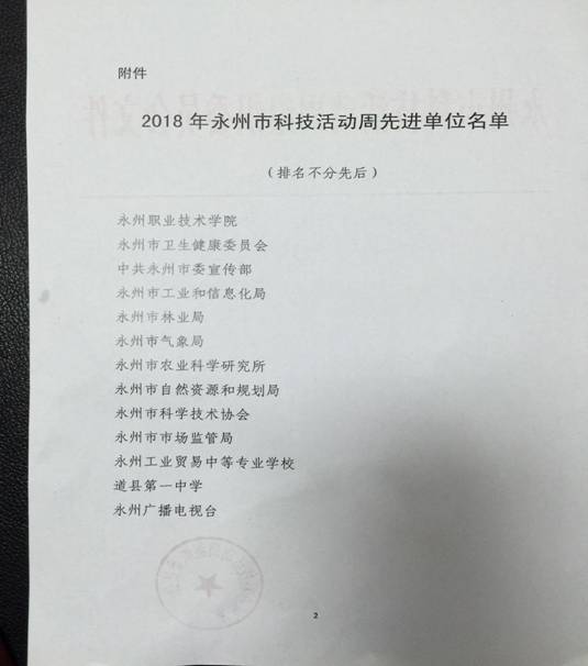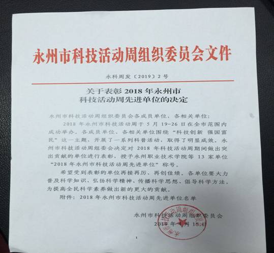 近日,从永州市科技局传来喜讯,永州职业技术学院荣获了“2018年永州市科技活动周先进单位”称号。